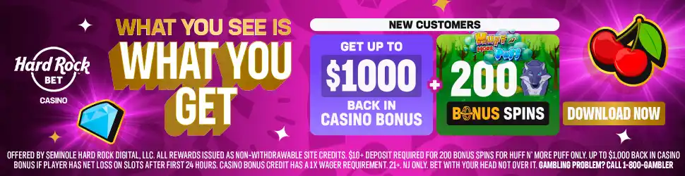 NJ Only. Offered by Seminole Hard Rock Digital, LLC. All Rewards issued as non-withdrawable site credits. $10+ deposit required for 200 Bonus Spins for Huff N’ More Puff only. Up to $1,000 back in casino bonus if player has net loss on slots after first 24 hours. Casino Bonus credit has a 1x wager requirement. Bet with your head not over it.